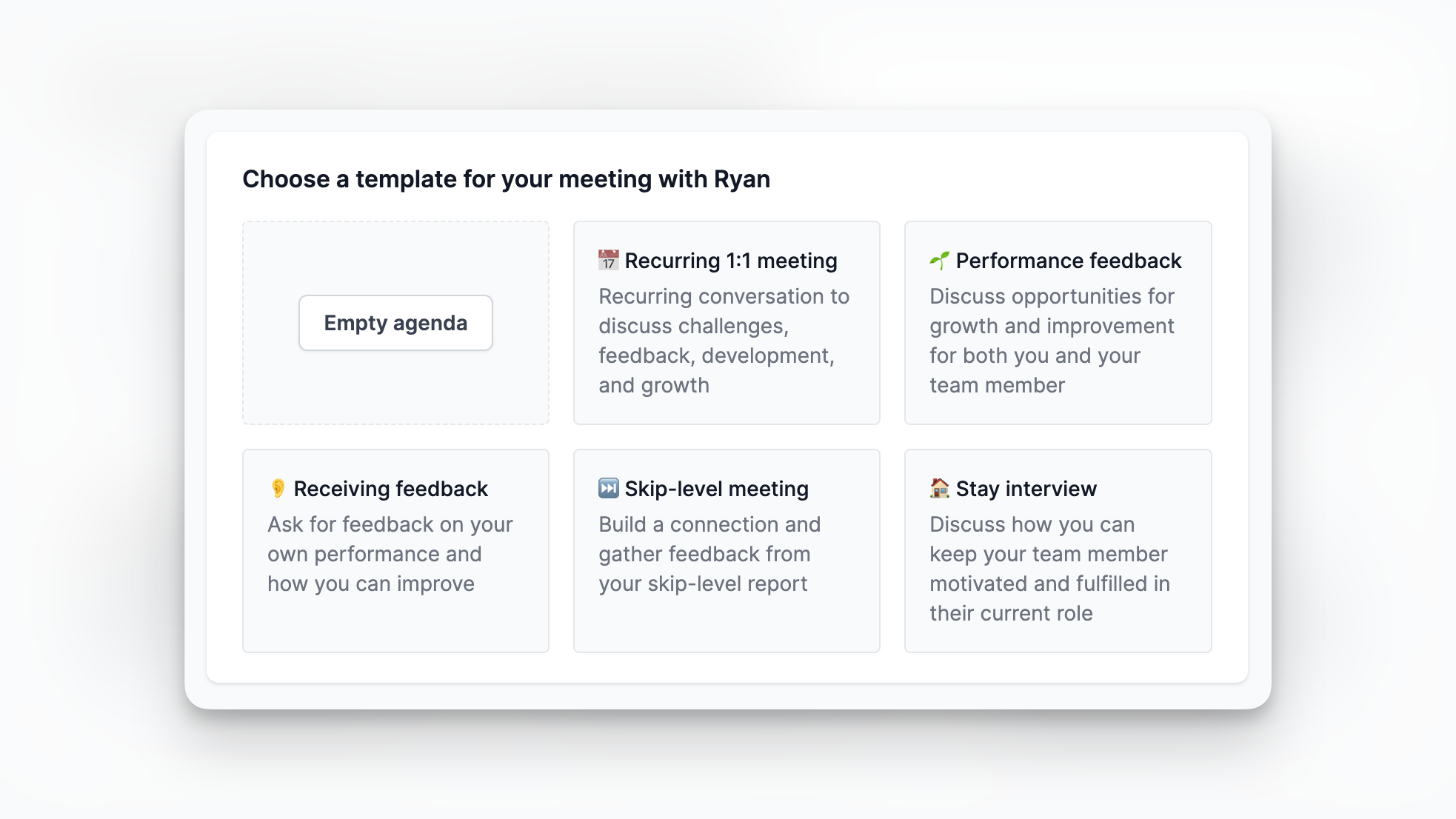 Simplify your preparation with customizable templates for various types of one-on-one meetings, ensuring you cover essential points and maintain consistent, productive conversations.