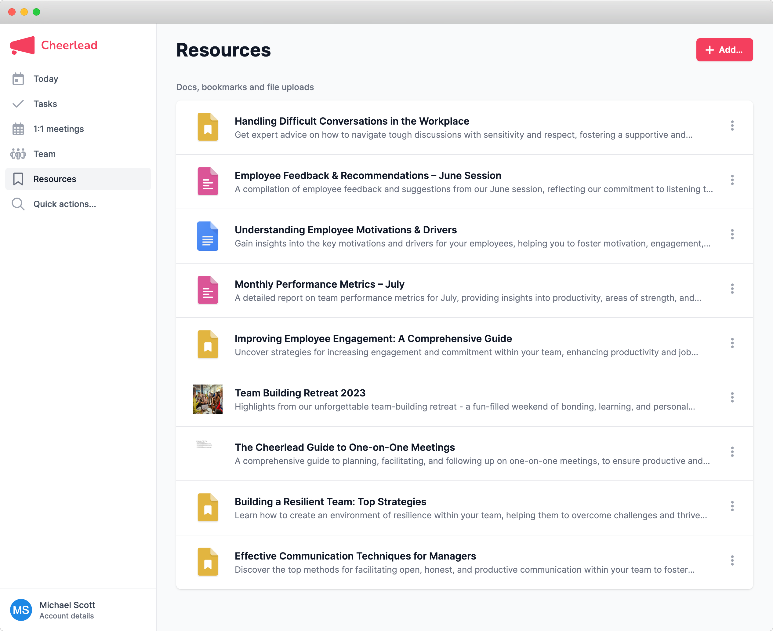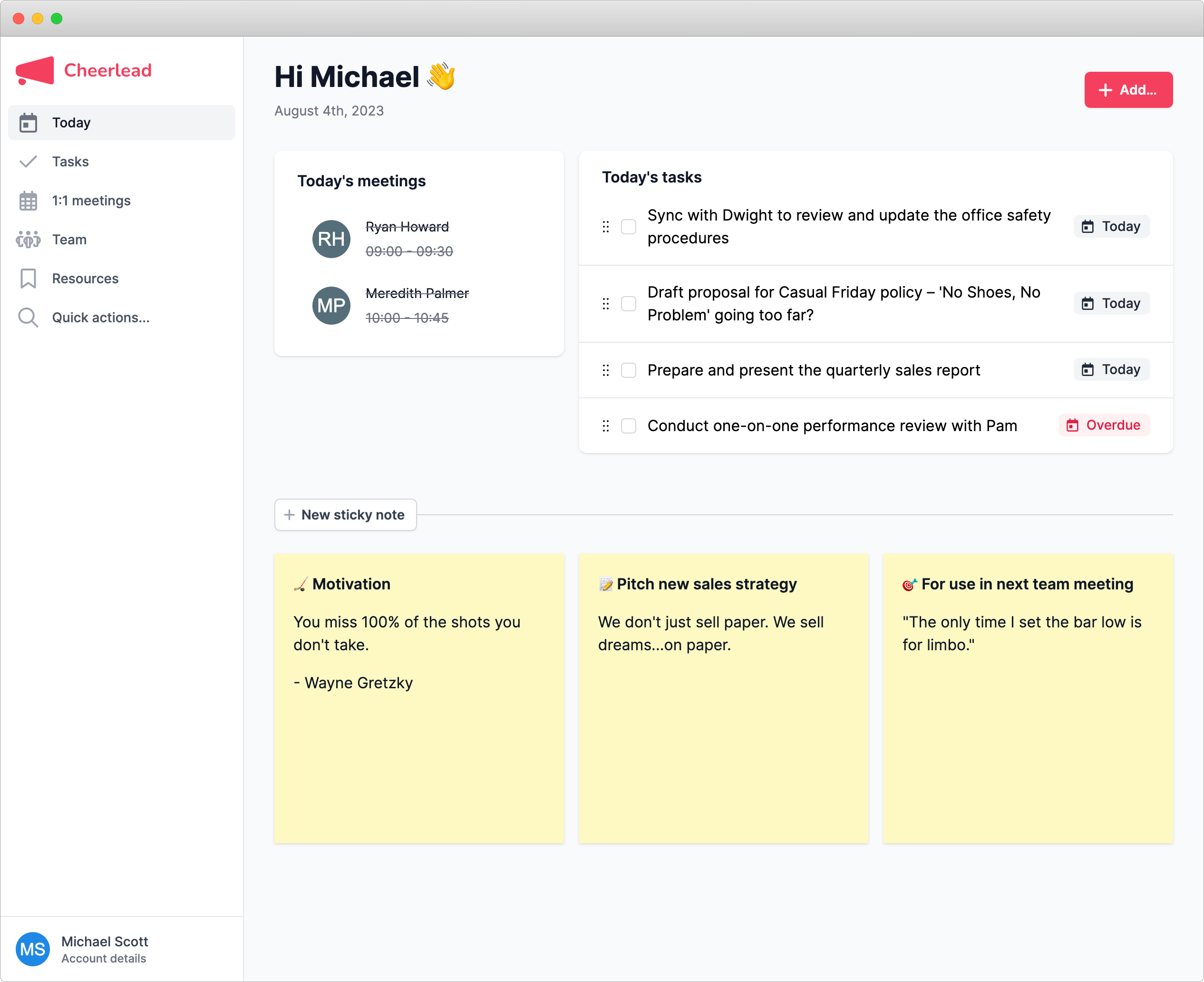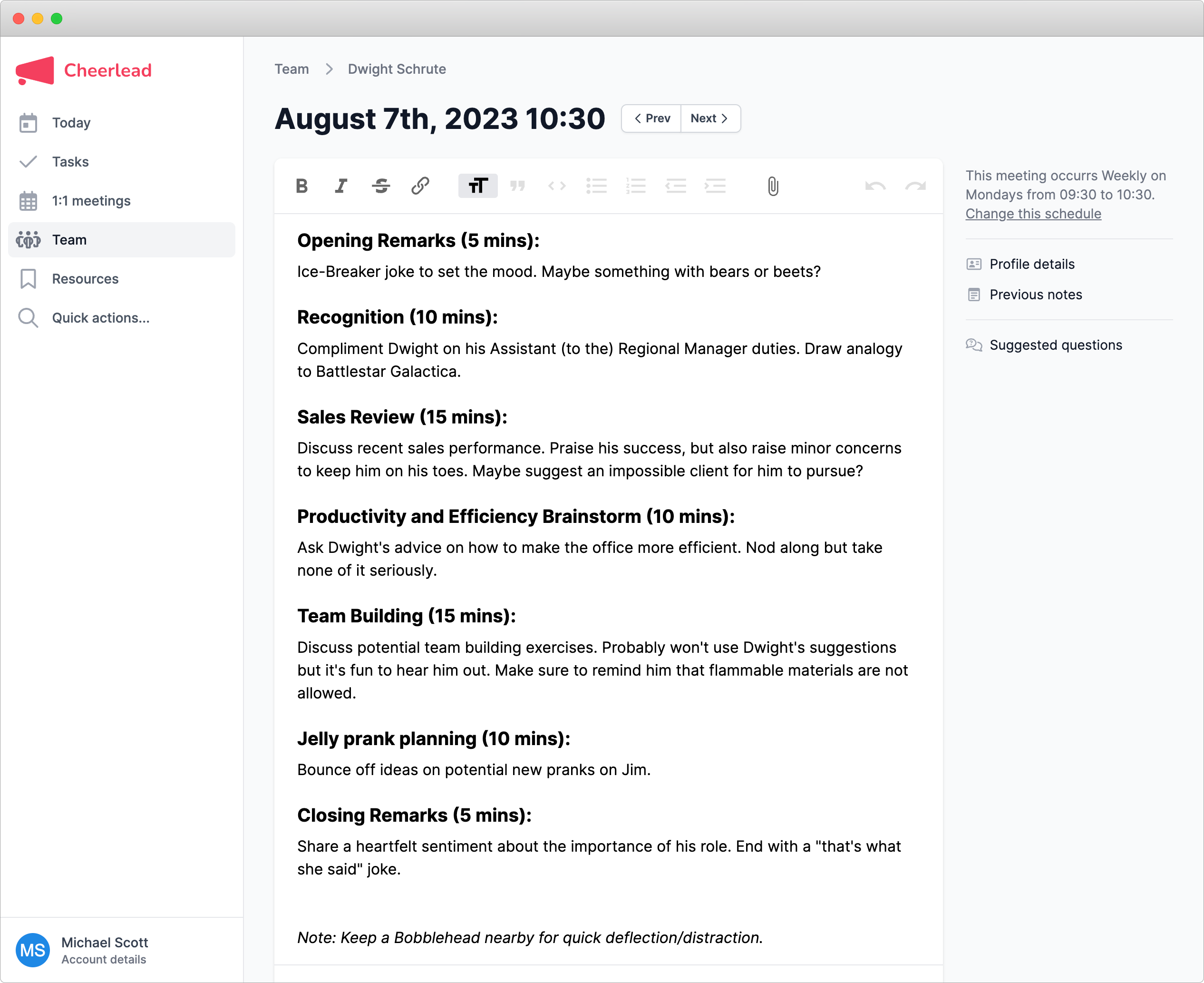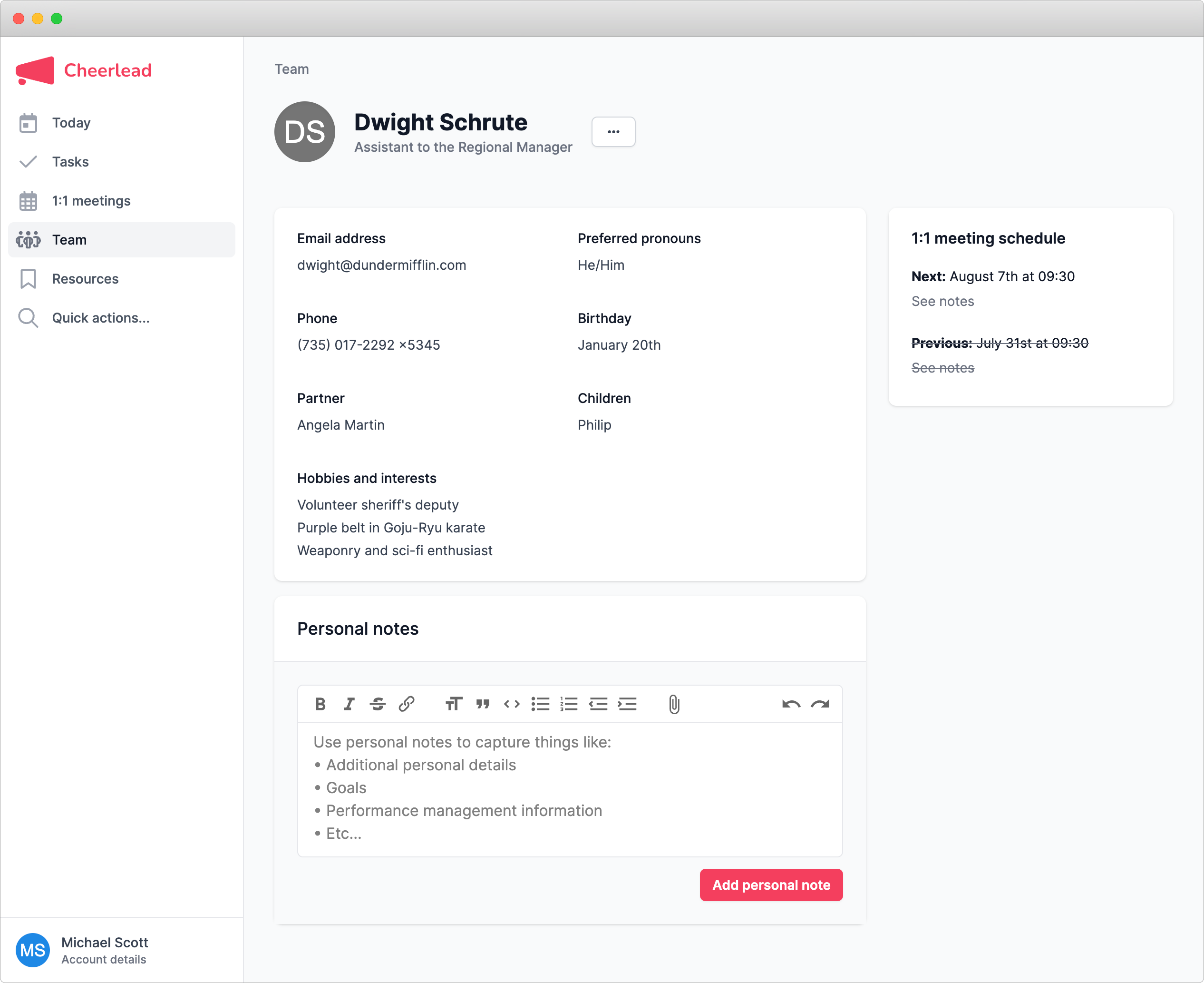 Ever since I started using Cheerlead, I've been able to connect on a personal level with my team. It's the little things – remembering their dog's name or their favorite weekend hobby – that makes all the difference.